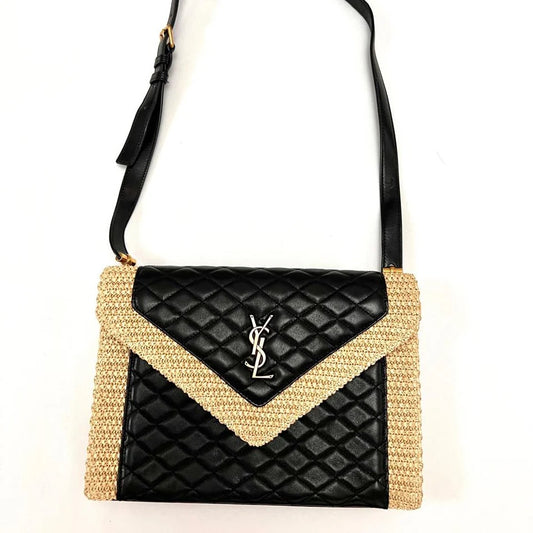 YSL Cream Raffia Black Leather Bag